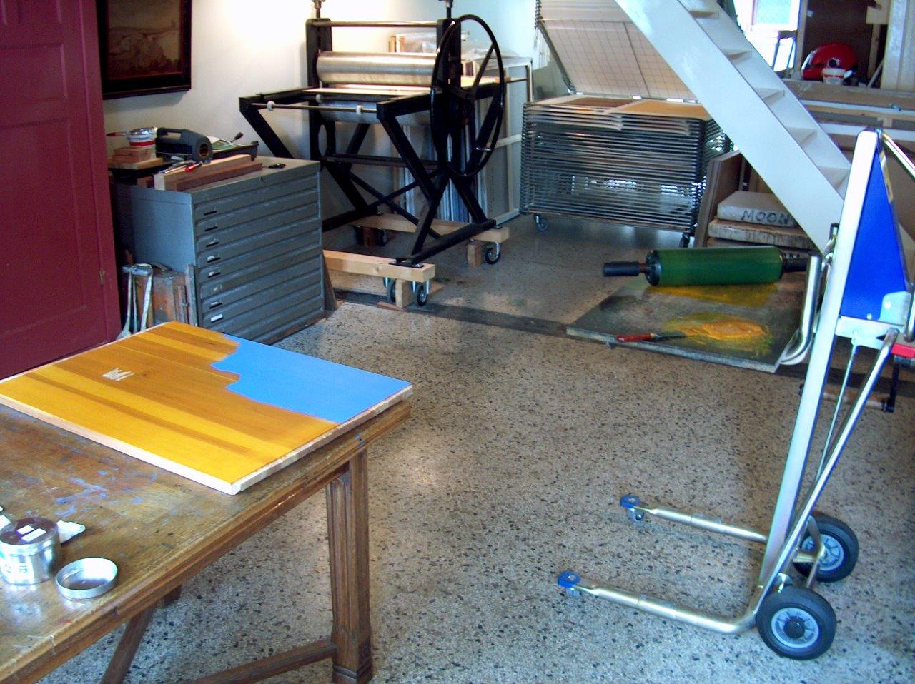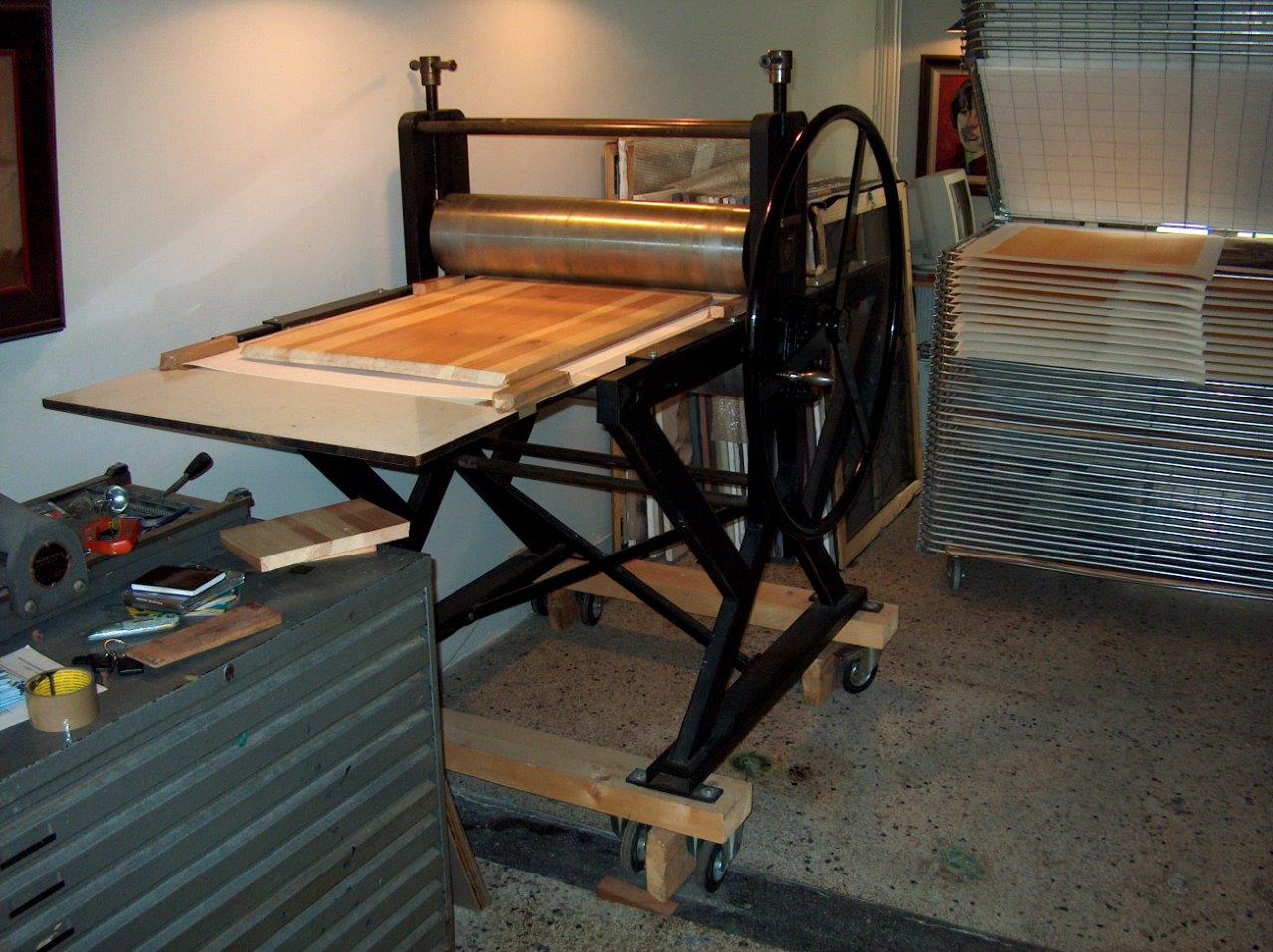 La presse J’utilise une presse à gravure de Polymetaal, un producteur d’équipements graphique Néerlandais. Cette presse, polyvalente, est aussi appropriée pour la gravure sur bois. Grâce à des broches, il est possible que le rouleau de presse pivote en hauteur. Si la planche de gravure est poussée vers l'avant par le rouleau, l'impression se décale par rapport à la précédente : c’est une erreur d'impression. Mettre d’autres lattes sur la table aide le rouleau à aller sur la gravure plus facilement. Le papier est mis sous la planche de gravure (à la différence des eaux-fortes).