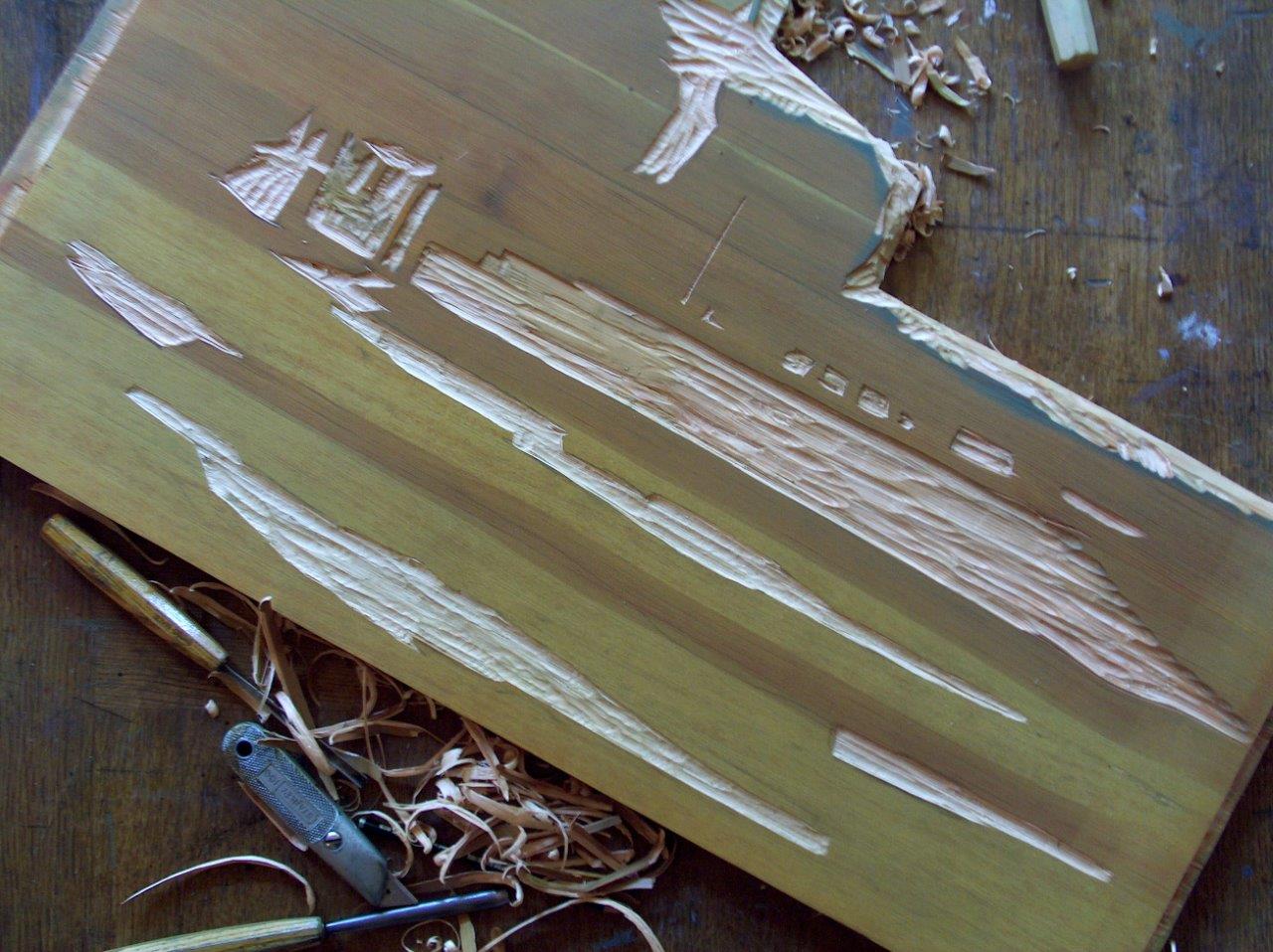Planche de septième couleur Les planches de pin ou d’épicéa ont des défauts et reliefs. C’est pourquoi lorsque l'impression est terminée ces dénivellations sont une variété de textures dans l'image imprimée : les veines donnent parfois des effets, dépôts de résine, fissures participent donc à l'image finale. Ainsi se développe, couche par couche, l'impression finale.