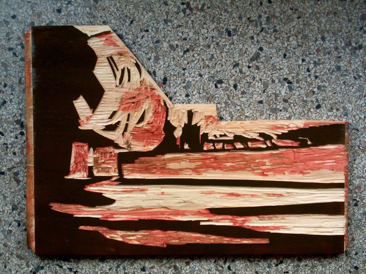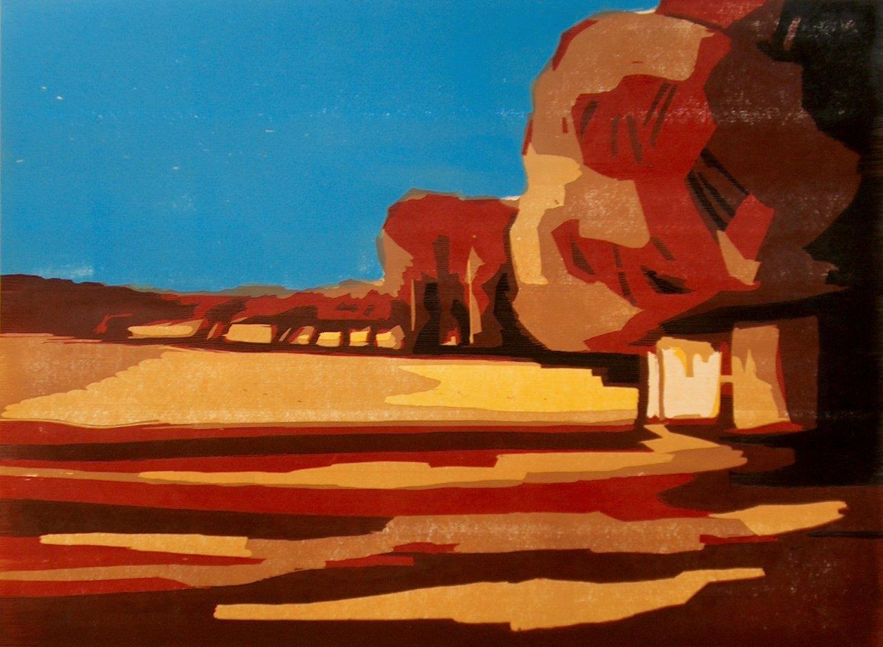 Couper, tailler La gravure sur bois me donne l'occasion de montrer l'image d'une journée de travail d’une manière différente. Couper exige la limitation : toutes les couleurs doivent être traduites en des formes simples. Tout est fait à partir d'une seule pièce de bois. J’utilise la technique de réduction : chaque couleur, et donc chaque tirage, est pris avec la même planche ; car chaque état de l'impression est irrévocable, la gravure demande un concept, ou au moins un point de départ. Pour moi, c'est toujours une peinture que j'ai fait précédemment.