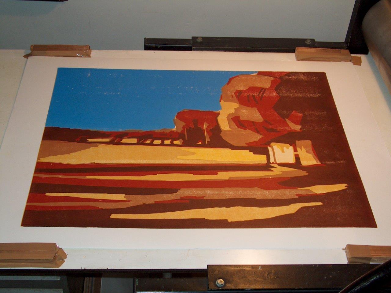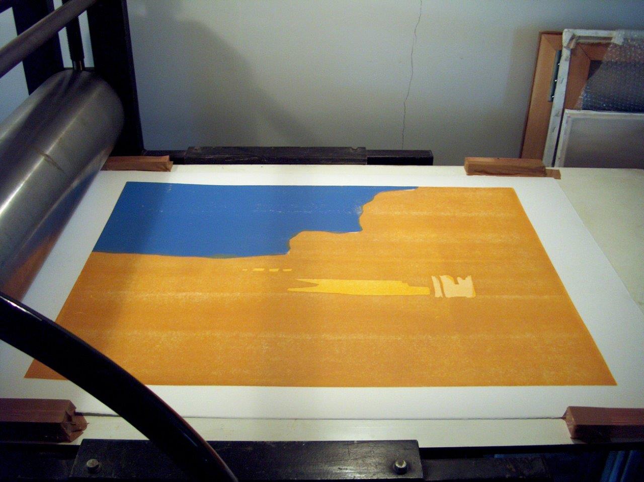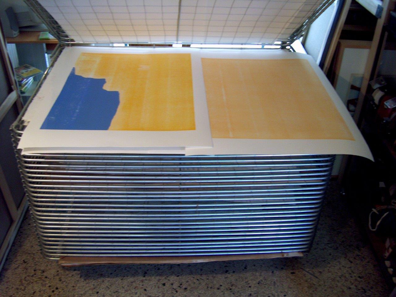 Quatrième couleur Il est préférable de démarrer avec des couleurs plus claires à cause de l'opacité de l’encre des couleurs sombres. La couleur suivante est donc transférée sur la précédente. Le papier blanc joue également un rôle dans l’apparence des couleurs. Les couleurs transparentes semblent plus brillantes par la surface de papier. J'utilise des encres à base d'huile pour la transparence et la luminosité de la couleur, et pour ralentir le séchage. Les couleurs doivent aussi coopérer dans le ton. Tout doit être pris en compte à partir de la première couleur. Même pour ça, il ya besoin d'un plan. En conséquence, les estampes ne sont pas comparables à des dessins. Le résultat final est visible plus tard, pas directement, comme dans le dessin ou la peinture.