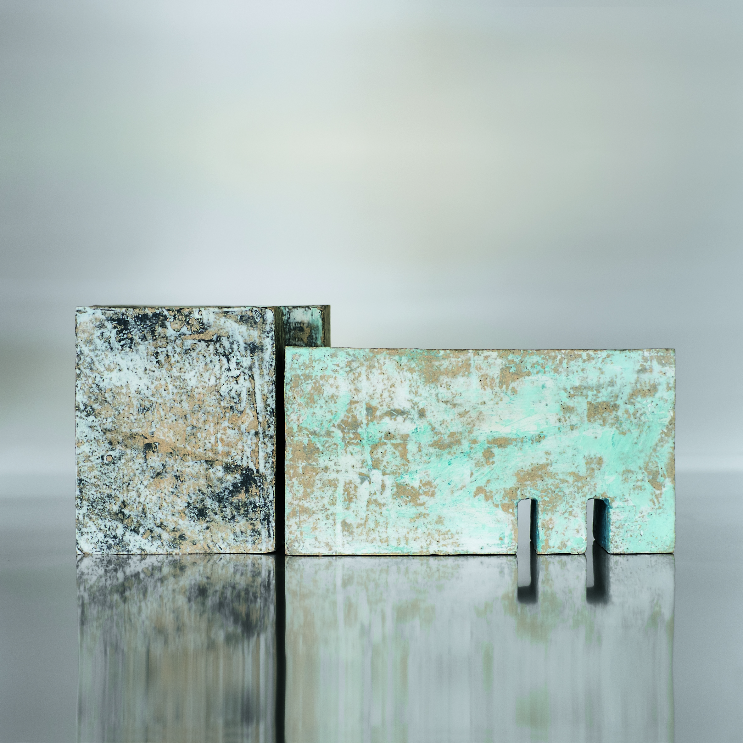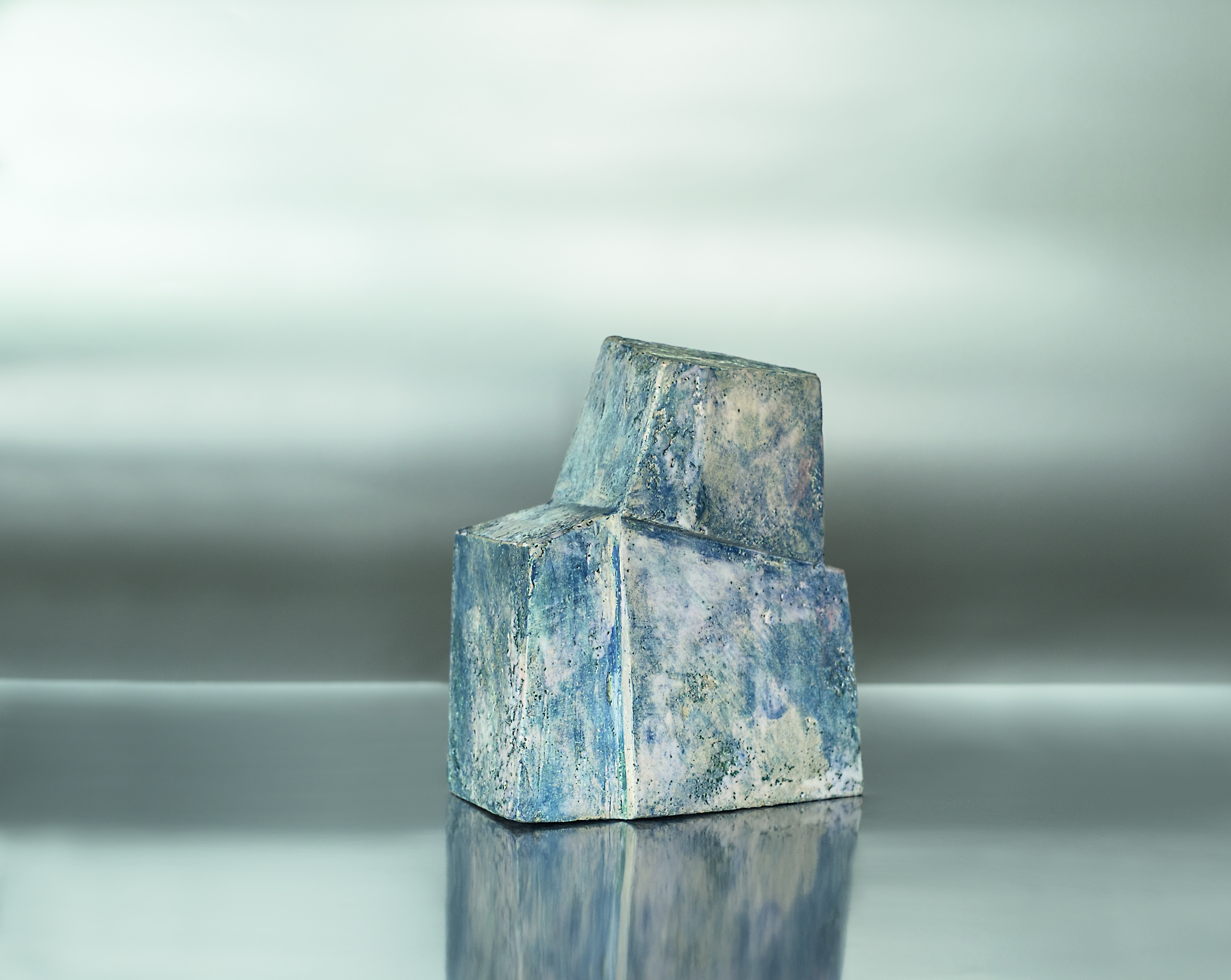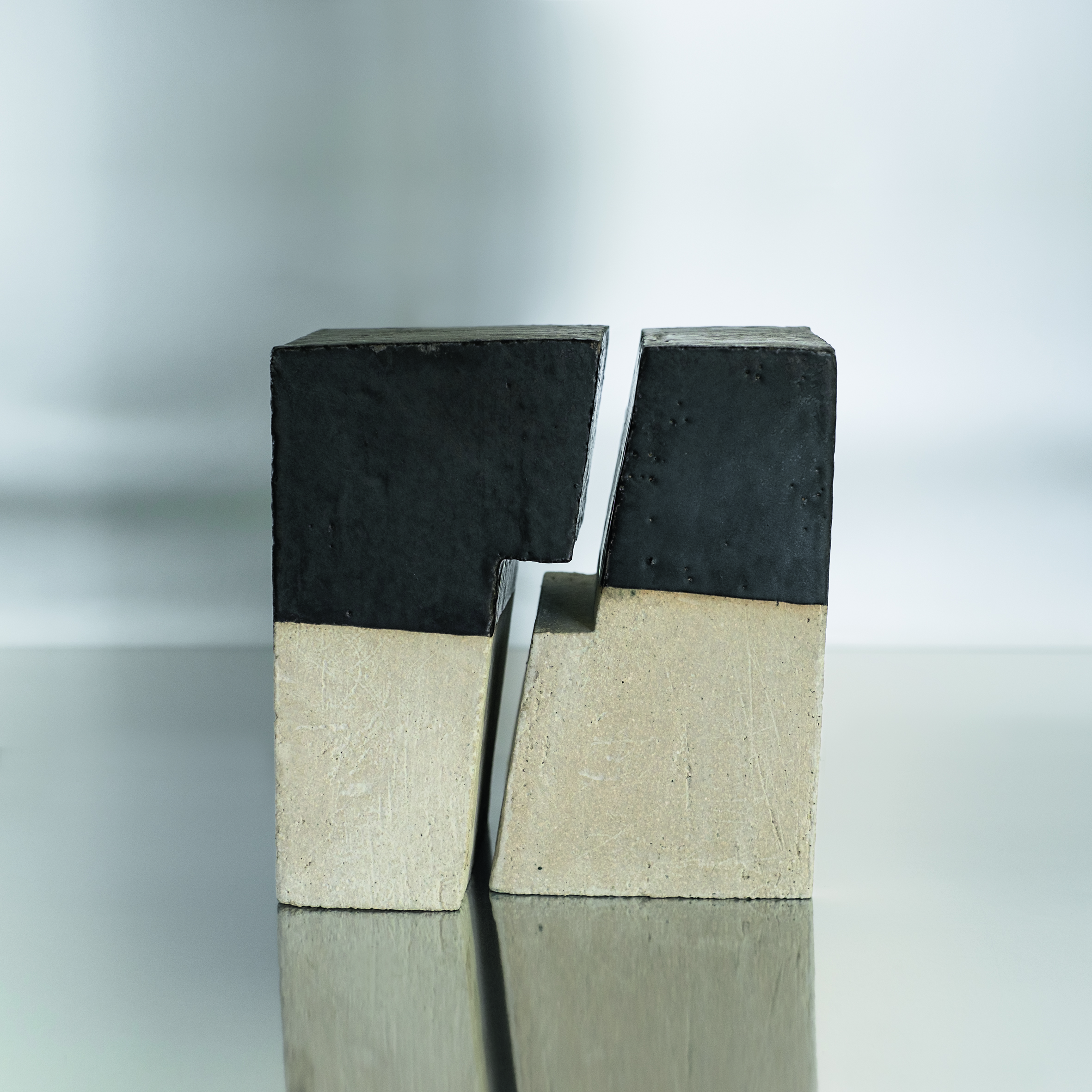 Marie-Noëlle Leppens confère à ces sculptures un sentiment d’équilibre précaire, en désaxant légèrement leur centre. On les perçoit à la fois ancrées et instables, régies par une géométrie fluide et dynamique, dans un mouvement léger de torsion qui décale les parallèles, dévie les droites de leur lancée et atténue la rigueur mathématique de la construction symétrique.