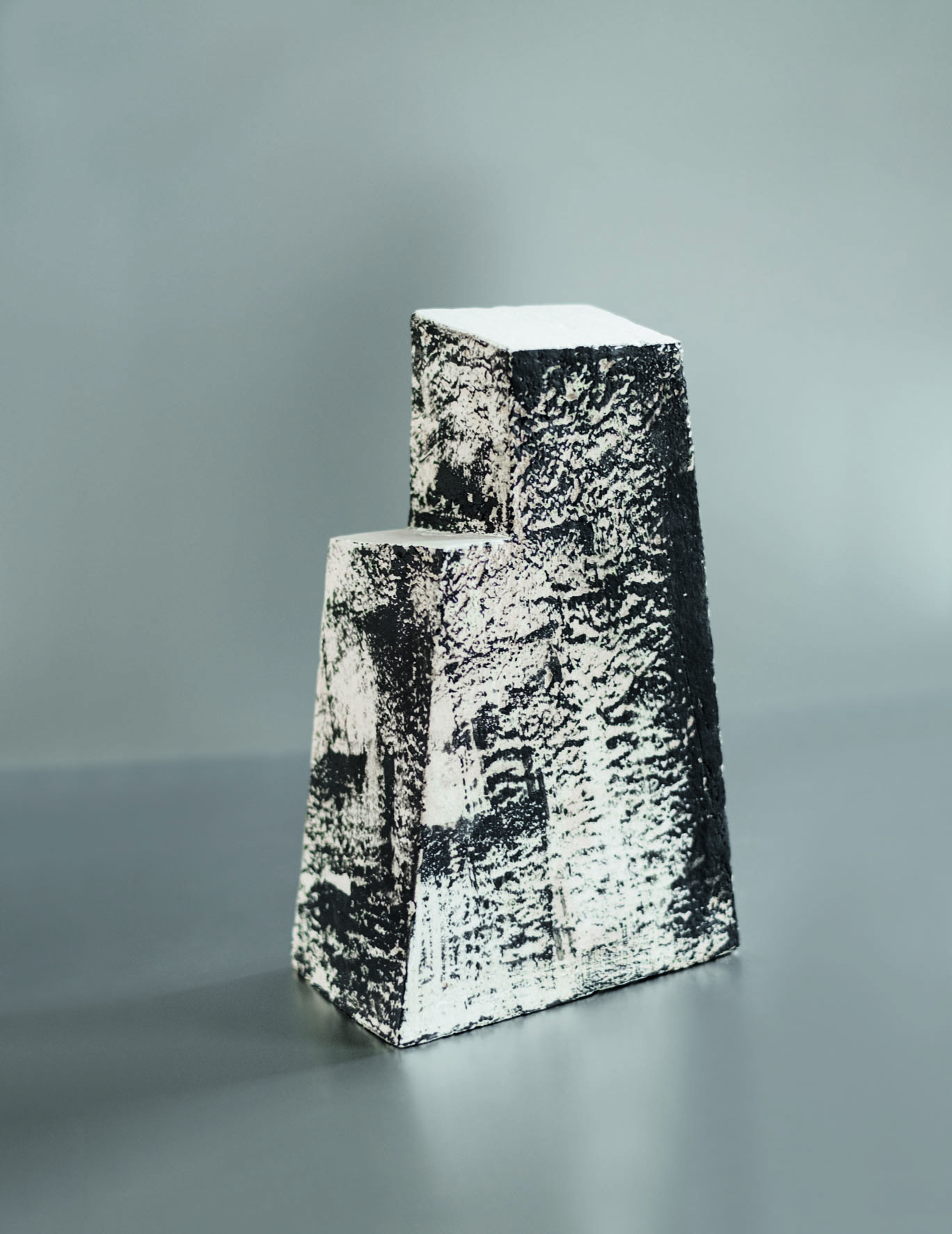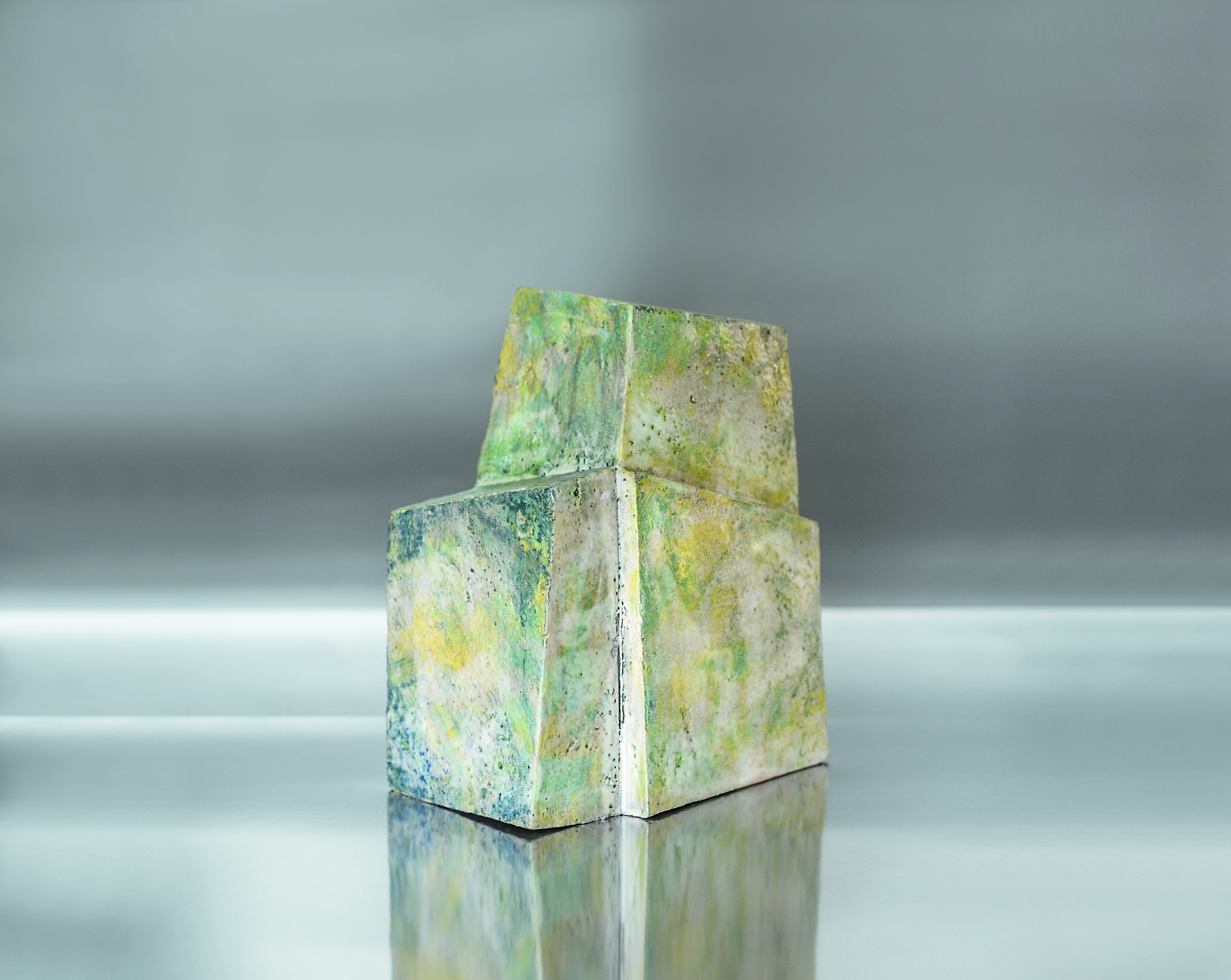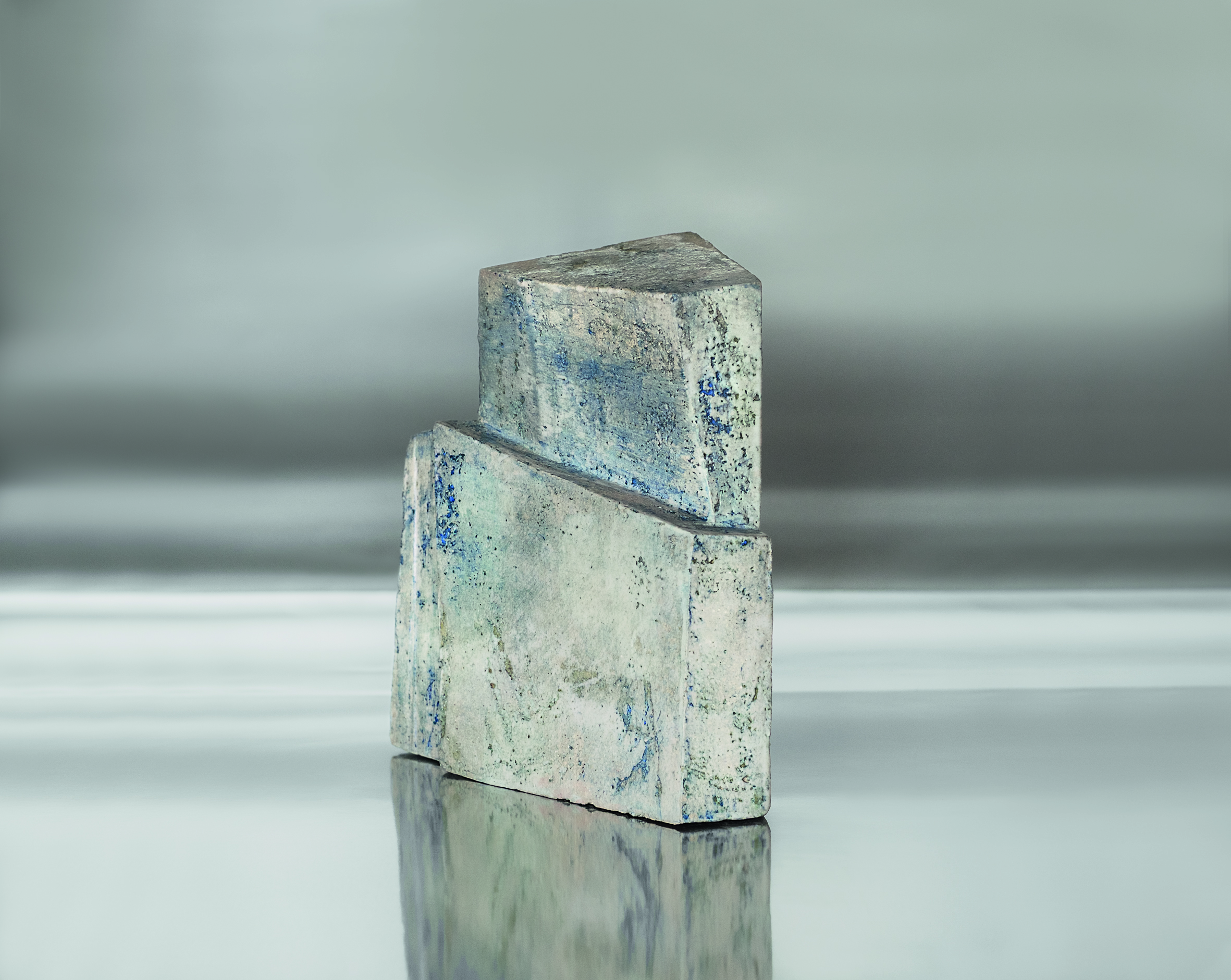 Marie-Noëlle Leppens confère à ces sculptures un sentiment d’équilibre précaire, en désaxant légèrement leur centre. On les perçoit à la fois ancrées et instables, régies par une géométrie fluide et dynamique, dans un mouvement léger de torsion qui décale les parallèles, dévie les droites de leur lancée et atténue la rigueur mathématique de la construction symétrique.
