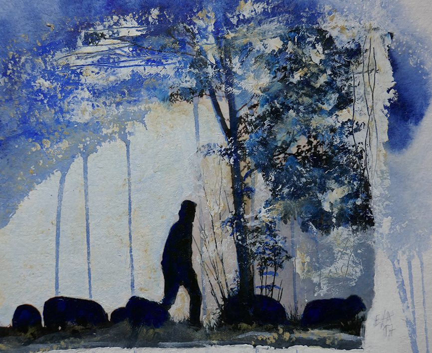 2015, Fuksa-Anselme, Au-delà des cimes, Techniques mixtes sur papier aquarelle, 14×19 cm