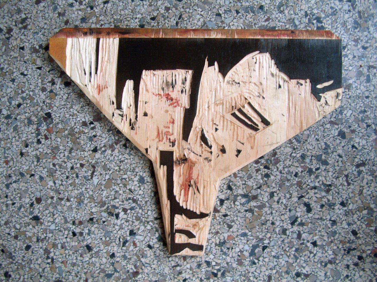 Planche de septième couleur Les planches de pin ou d’épicéa ont des défauts et reliefs. C’est pourquoi lorsque l'impression est terminée ces dénivellations sont une variété de textures dans l'image imprimée : les veines donnent parfois des effets, dépôts de résine, fissures participent donc à l'image finale. Ainsi se développe, couche par couche, l'impression finale.