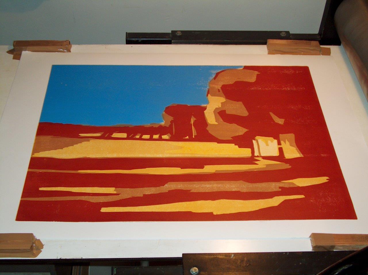 Quatrième couleur Il est préférable de démarrer avec des couleurs plus claires à cause de l'opacité de l’encre des couleurs sombres. La couleur suivante est donc transférée sur la précédente. Le papier blanc joue également un rôle dans l’apparence des couleurs. Les couleurs transparentes semblent plus brillantes par la surface de papier. J'utilise des encres à base d'huile pour la transparence et la luminosité de la couleur, et pour ralentir le séchage. Les couleurs doivent aussi coopérer dans le ton. Tout doit être pris en compte à partir de la première couleur. Même pour ça, il ya besoin d'un plan. En conséquence, les estampes ne sont pas comparables à des dessins. Le résultat final est visible plus tard, pas directement, comme dans le dessin ou la peinture.