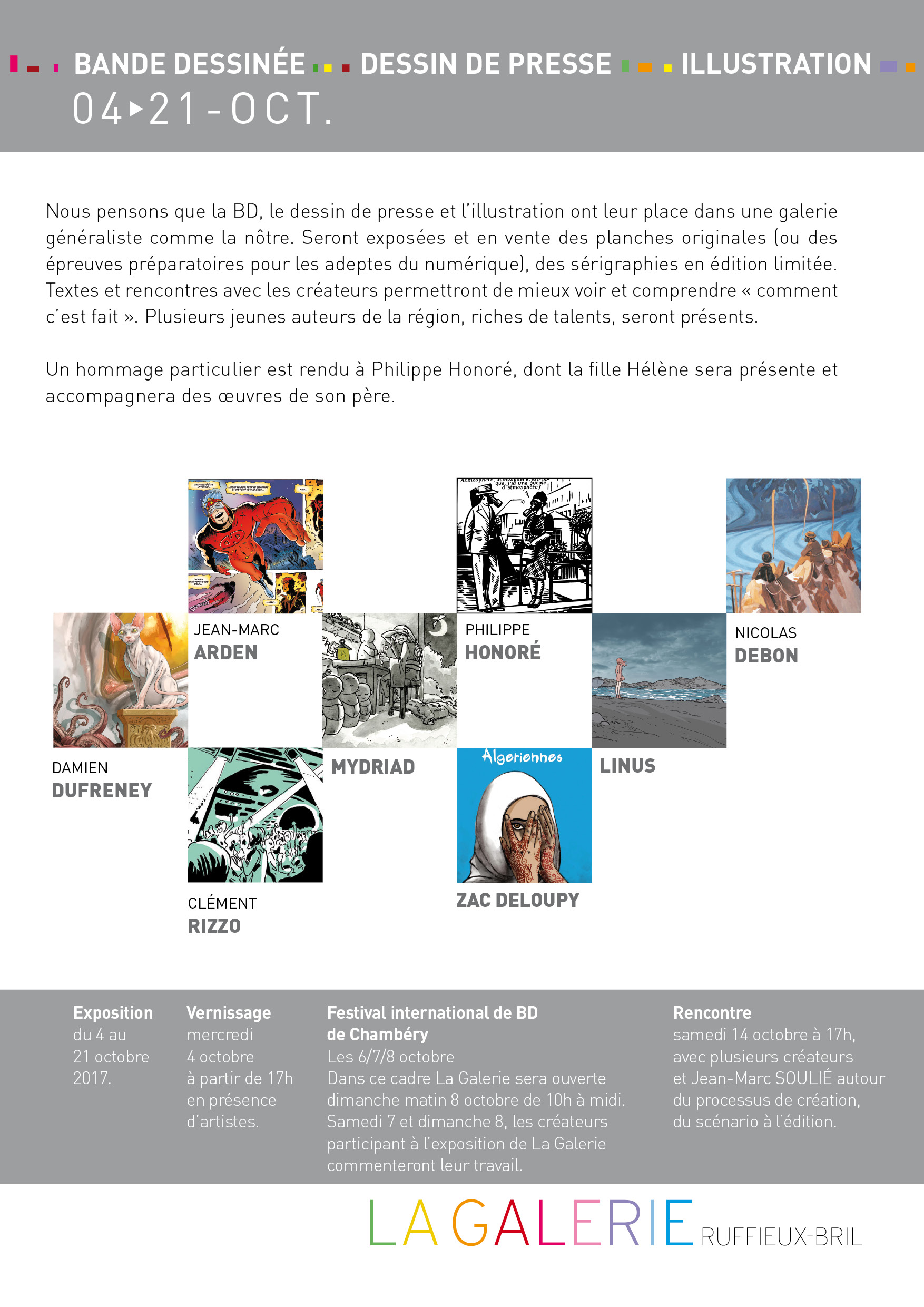 Categories: ArtistesTags: Art, Artiste, Bande Dessinée, Chambéry, Clément Rizzo, Damien Dufreney, Dessin, Exposition, Galerie d'art, Galerie Ruffieux Bril, Illustration, Jean-Marc Arden, Linus, Mydriad, Nicolas Debon, Philippe Honoré, Zac Deloupy